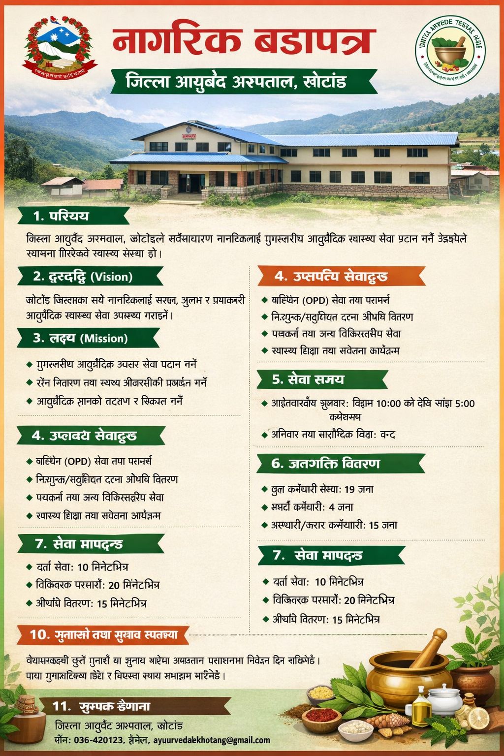 खोटाङ जिल्लाका सबै नागरिकलाई सहज, सुलभ र प्रभावकारी आयुर्वेदिक स्वास्थ्य सेवा उपलब्ध गराउने।