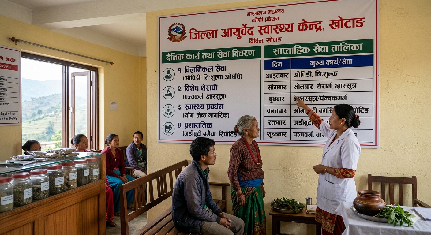 खोटाङस्थित जिल्ला आयुर्वेद स्वास्थ्य केन्द्रमा साप्ताहिक रूपमा सञ्चालन हुने कार्यतालिकाको विवरण तल दिइएको छ: